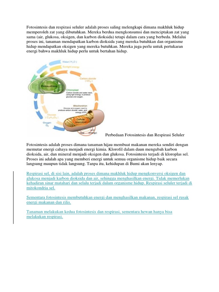Pendahuluan salah satu ciri hidup yang hanya dimiliki khusus oleh tumbuhan hijau adalah kemampuan dalam menggunakan zat karbon dari udara untuk diubah menjadi bahan organik serta diasimilasi dalam tubuh tumbuhan. Selama fenomena ini molekul mengalami oksidasi dan akseptor terakhir elektron dalam banyak kasus adalah molekul anorganik. Ikhtisar dan perbedaan utama 2. Respirasi sel adalah suatu proses yang menghasilkan energi dalam bentuk atp adenosin trifosfat.