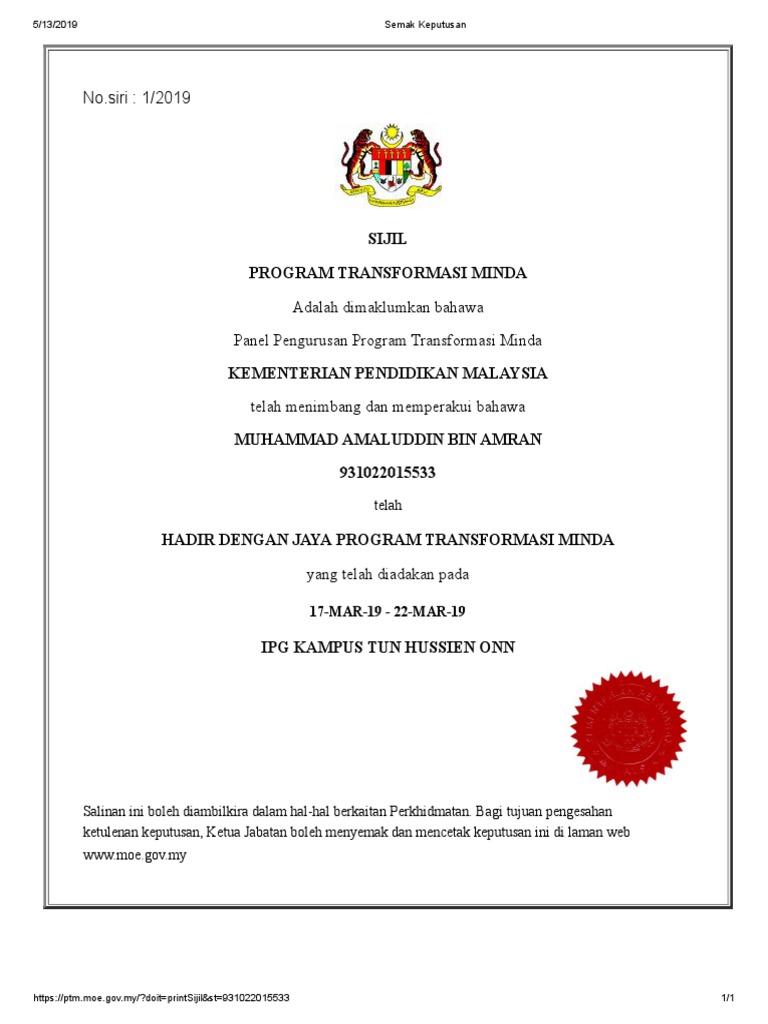 Semakan keputusan ptm 2019. Sekiranya ada pertanya sila berhubung dengan. Perenggan 3 1 garis panduan penilaian program transformasi minda lampiran c pp 14 2012 penilaian ptm adalah berasaskan kepada tiga 3 kriteria utama iaitu disiplin dan personaliti 50 markah komitmen 30 markah dan penilaian kefahaman 20 markah. Tahniah diucapkan kepada kalangan guru guru yang terlibat sama dalam program transformasi minda ptm yang dikendalikan oleh kementerian pendidikan malaysia kpm. Semakan keputusan pertukaran juruteknologi mamal perubatan gred u29 berkuat kuasa 25 mac 2019.