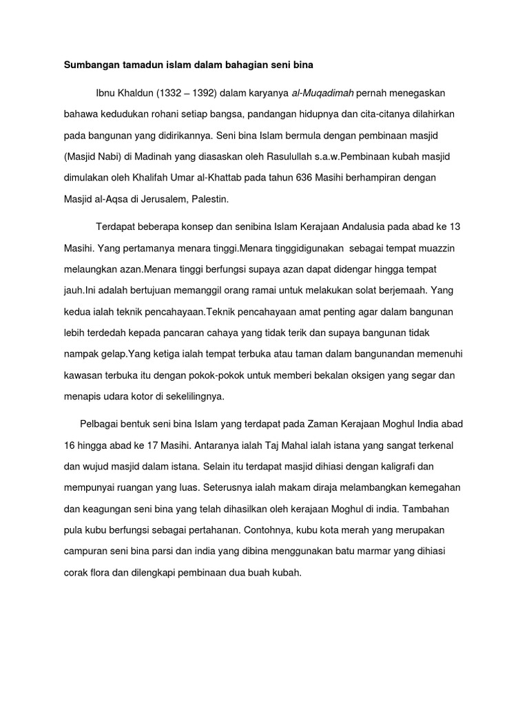 Seni bina dalam tamadun islam. Ibnu khaldun 1332 1392 dalam karyanya al muqadimah pernah menegaskan bahawa kedudukan rohani setiap bangsa pandangan hidupnya dan cita citanya dilahirkan pada bangunan yang didirikannya. Tamadun islam mempunyai keunikannya tersendiri dalam menonjolkan hasil seni binaannya tidak hairanlah jika pernah. Bahkan pembangunan ilmu dalam dunia islam telah diakui sebagai pemangkin kepada zaman renaissance atau pembaharuan di eropah yang akhirnya melahirkan satu tamadun yang gemilang. Masjid o pencapaian dan pembangunan seni bina telah bermula sejak zaman rasulullah s a w dengan pembinaan masjid quba dan masjid nabawi sebagai pusat tarbiah pendidikan dan pentadbiran dalam menyusun strategi ekonomi peradaban perang dan sebagainya.