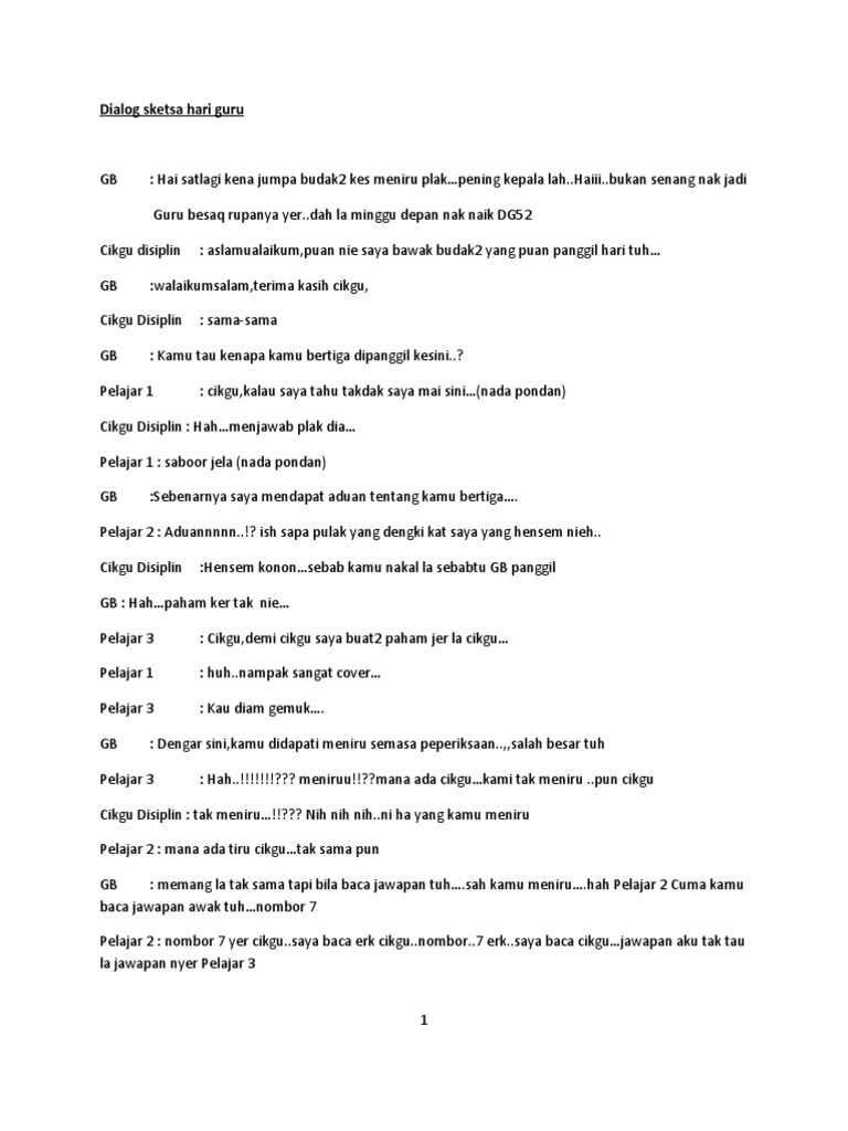 Skrip sketsa lawak hari guru. Bersyukur kita kehadrat allah swt kerana dengan limpah kurnia dan keizinan nya dapat sama sama kita berkumpul di dataran yang mulia ini untuk meraikan sambutan hari guru dan hari pekerja bagi tahun 2013 dengan tema. Siang hari kala. B eberapa hari yang lalu pintu rumahku diketuk 3 kali. Polis 1 awak dibebaskan.