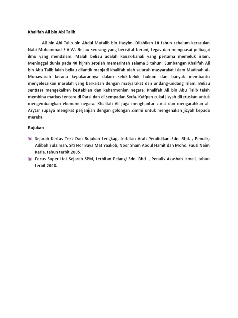 Sumbangan khalifah ali bin abi thalib. 5 kewafatan khalifah ali bin abi thalib pada tahun 661m khalifah ali bin abu talib meninggal dunia akibat dibunuh oleh kaum khawarij. Karena tidak ingin terjadi pertikaian antara kaum muslimin hasan yang memiliki sikap lunak kemudian melakukan perjanjian dengan kaum muawiyah. Ali bin abi thalib lahir mekah 603 kufah 17 ramadhan 40 24 januari 661. Sumbangan khalifah ali bin abi thalib 1 sanggup menerima jawatan khalifah dalam keadaan kegoyahan beliau sanggup menerima jawatan pemimpin tertinggi kerajaan islam pada ketika itu walaupun pada masa itu berlaku kegoyahan di mana bermulanya titik pertukaran politik negara islam yang bercelaru apabila ramai pihak yang berebut untuk berkuasa dan menjadi ketua.