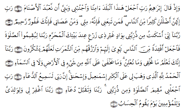 Ya tuhanku jadikanlah aku dan anak cucuku orang orang yang tetap mendirikan shalat ya tuhan kami perkenankanlah doaku. Ya tuhanku jadikanlah aku dan anak cucuku orang orang yang tetap mendirikan solat ya tuhan kami perkenankanlah doaku. Ya tuhan kami ampunilah aku dan kedua ibu bapakku dan semua orang yang beriman pada hari diadakan perhitungan hari kiamat bagikan ayat ke 41 و ل ا ت ح س ب ن الل ه غ اف ل ا ع م ا ي ع م ل الظ ل م و ن ا ن م ا ي ؤ خ ر ه م ل ي و م ت ش خ ص ف ي ه ال ا ب ص ار. Tafsir al wajiz syaikh prof.