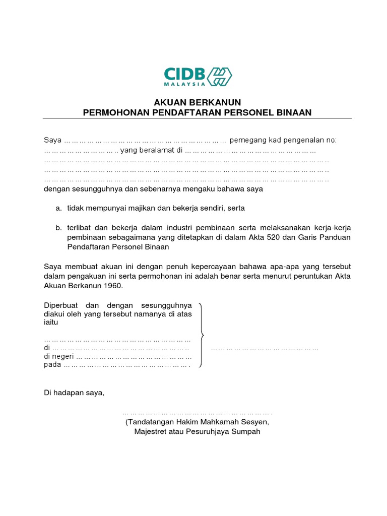 Surat Akuan Sumpah Bekerja Sendiri Cidb