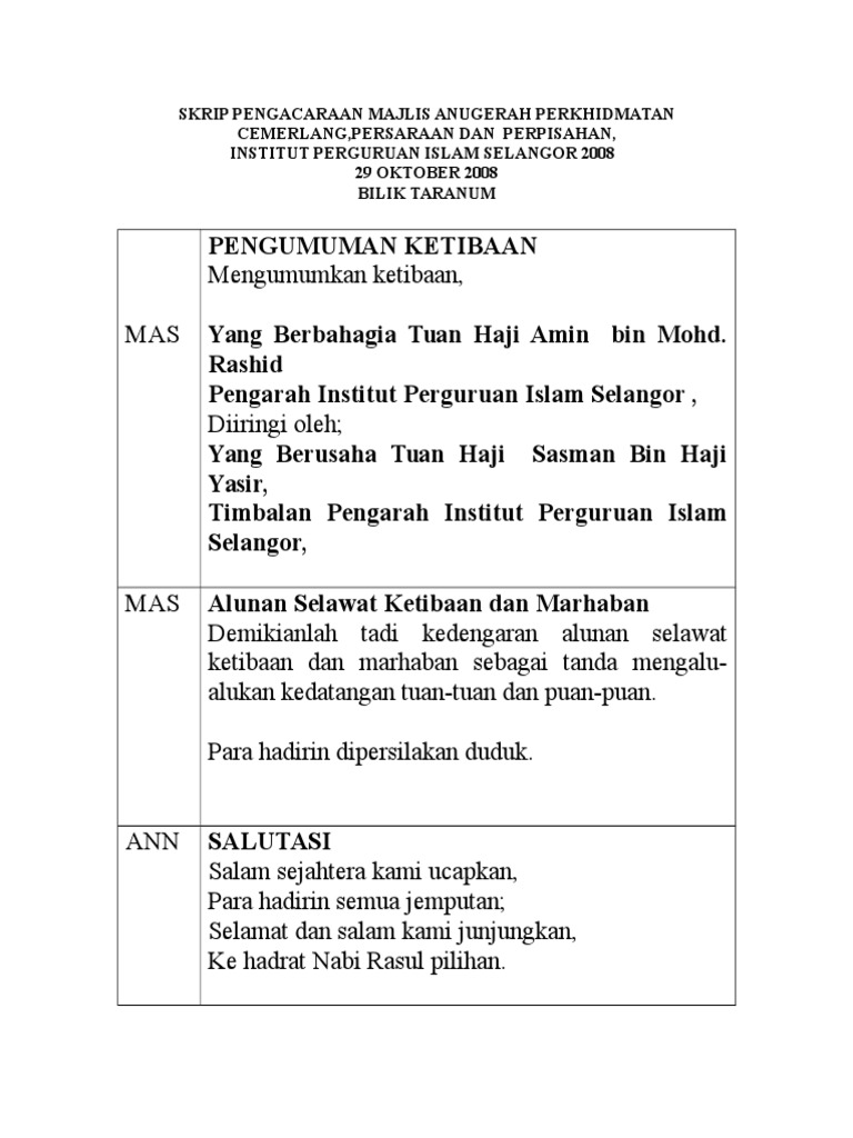 Teks pengacara majlis anugerah perkhidmatan cemerlang. Majlis penyampaian anugerah perkhidmatan cemerlang dan hari kualiti risda negeri terengganu tahun 2008 ucapan perasmian tn. Dipersilakan majlis mengucapkan terima kasih kepada yang berbahagia dato nafsiah hj. Alhamdulillah bersyukur kita ke hadrat ilahi kerana dengan izin dan limpah kurnianya dapat kita sama sama berkumpul di dewan utama hotel sabah sandakan pada pagi ini bagi menjayakan majlis penyampaian anugerah khidmat cemerlang 2013 bagi tahun 2014. Shah alam 1 hall sacc convention centre 10 april 2018.