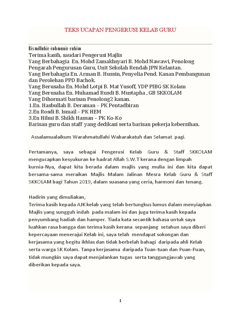 Majlis makan malam sempena hari guru 2012 1 majlis penutup bulan kemerdekaan 2017 1 majlis penutupan bengkel kecemerlangan upsr 2017 1. Teks ucapan pengerusi majlis makan malam dan majlis sanjungan budi lambaian kasih smk bukit goh 2016 sebahagiannya dibaca pada majlis tersebut assalaamualaikum warahmatullahi wabarakatuh dan salam sejahtera bunga tanjung di tengah pekan tiupan bayu mencelah suria kalimah nan agung saya mulakan salam sejahtera menambah ceria. Ucapan jamuan makan malam sempena persaraan pengetua teks ucapan persaraan pn pengetua 26 jun 2008 oleh. Juga merupakan penulis teks ucapan untuk pegawai kementerian dan pensyarah universiti.