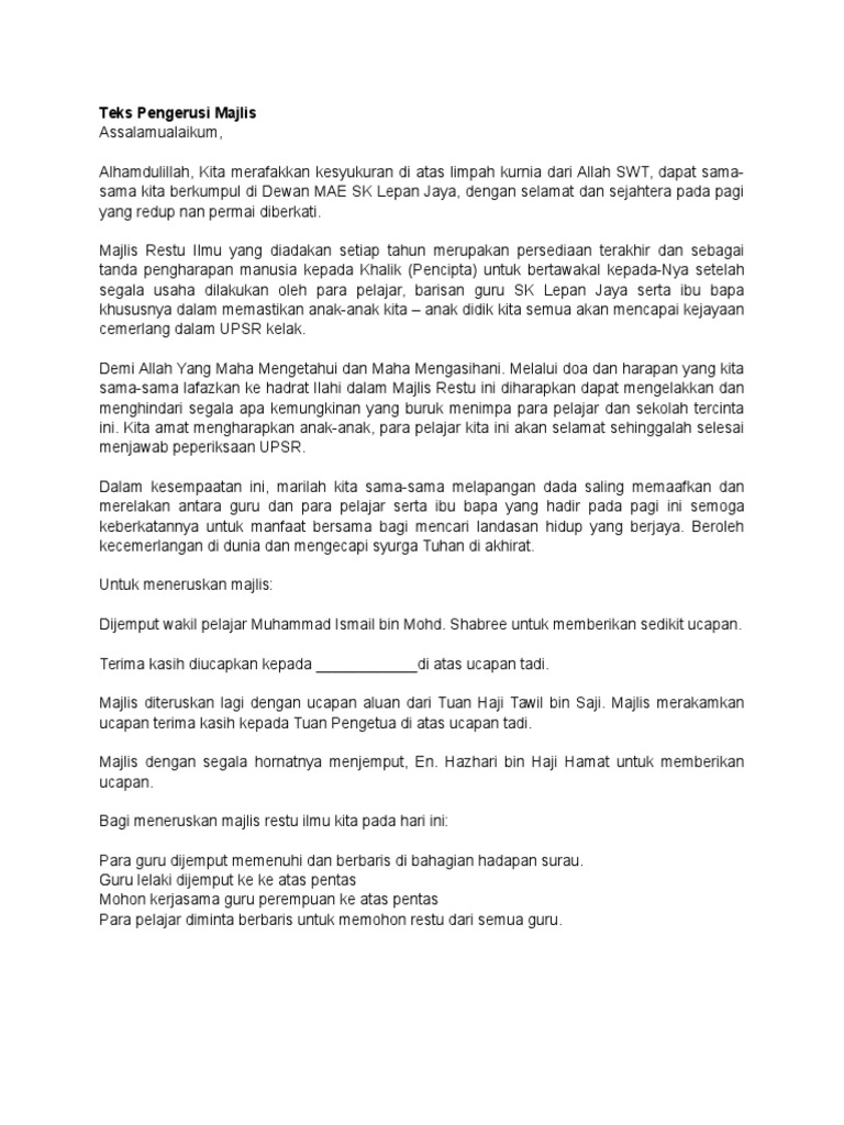Contoh teks pengacaraan restu ilmu. Academia edu is a platform for academics to share research papers. Acara seterusnya ialah pelajar bersalam dengan semua guru memohon maaf mengucapkan terima kasih dan memohon restu halalkan segala ilmu untuk itu semua guru diminta berbaris di bawah pentas dan semua pelajar bersalaman mengikut barisan bermula dengan barisan yang paling tepi di sebelah kiri. Mamat en ahmad sauki b harun guru kanan teknik vokasional selaku guru penyelaras pt3.